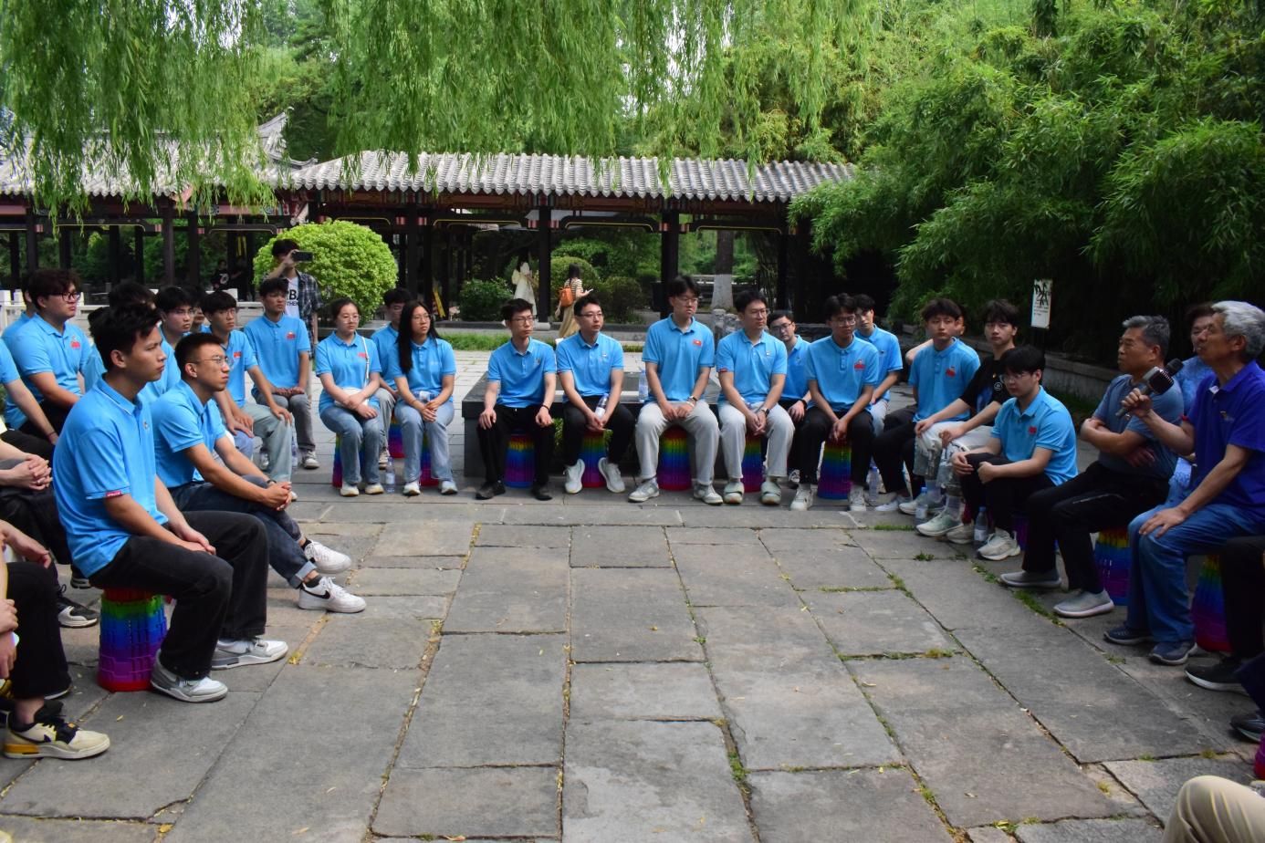 参观结束后,同学们和党员前辈在济南五龙潭凉亭下,围绕“学党史,守党纪”进行了一次深入的交流座谈。前辈们首先分享了自己年轻时入党的经历,以及他们对党的忠诚和对理想的执着追求,他们的故事激发了学生们的思考,同学们也积极发言,表达了自己的感悟和决心。一位学生说:“今天的经历让我深刻感受到,作为新时代的大学生党员,我们不仅要学好专业知识,更要传承和发扬好党的光荣传统和优良作风。”另一位学生则表示:“前辈的故事让我明白,无论时代如何变迁,坚定的理想信念和为人民服务的宗旨永远不会过时。”座谈会的最后,我校关心下一代委员会秘书长、离退休工作处处长高卫红对学生们提出了殷切的希望,她鼓励大家要将今天的学习成果转化为实际行动,将个人的梦想与国家的发展紧密结合起来,为实现中华民族的伟大复兴贡献青春力量。