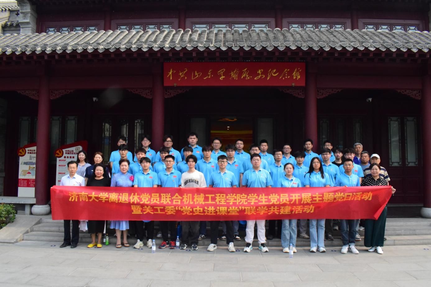 活动首先来到中共山东早期历史纪念馆参观,学生党员与党员前辈肩并肩,一同参观了纪念馆内珍贵的历史图片和文物。每一处展品都似乎在诉说着那段波澜壮阔的历史,讲述着那些关于牺牲、信念和胜利的故事。大家或驻足凝视,或低声讨论,每个人都被这些革命文物所蕴含的精神力量所震撼。