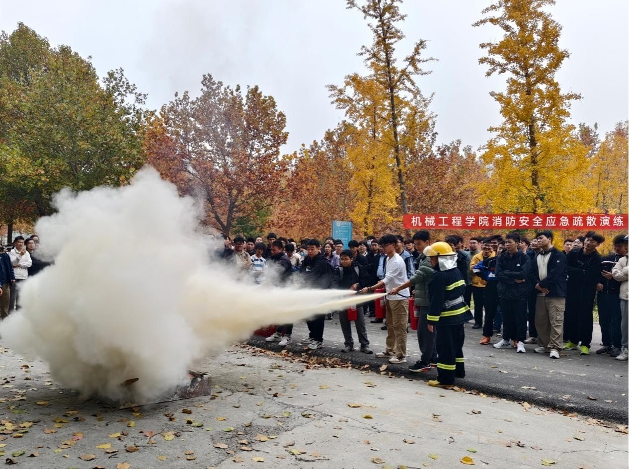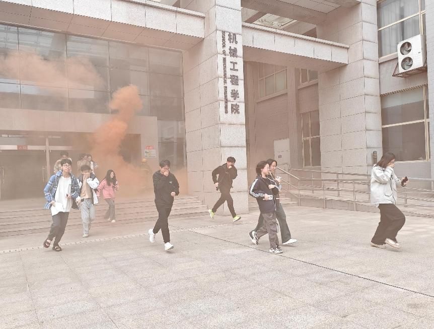 随着机械楼警报声响起,同学们反应迅速,按照预定的疏散路线,弯腰低姿快速向安全区域撤离,充分体现了同学们良好的消防安全意识和自救互救能力。随后学院老师及学生在机械楼前进行灭火器使用培训,同学们化身“消防员”,手持灭火器,亲自扑灭火焰,深刻体验了“一提、二拔、三压、四喷”的使用口诀。这种实操经验让大家更加生动地记住了使用灭火器的正确方法。